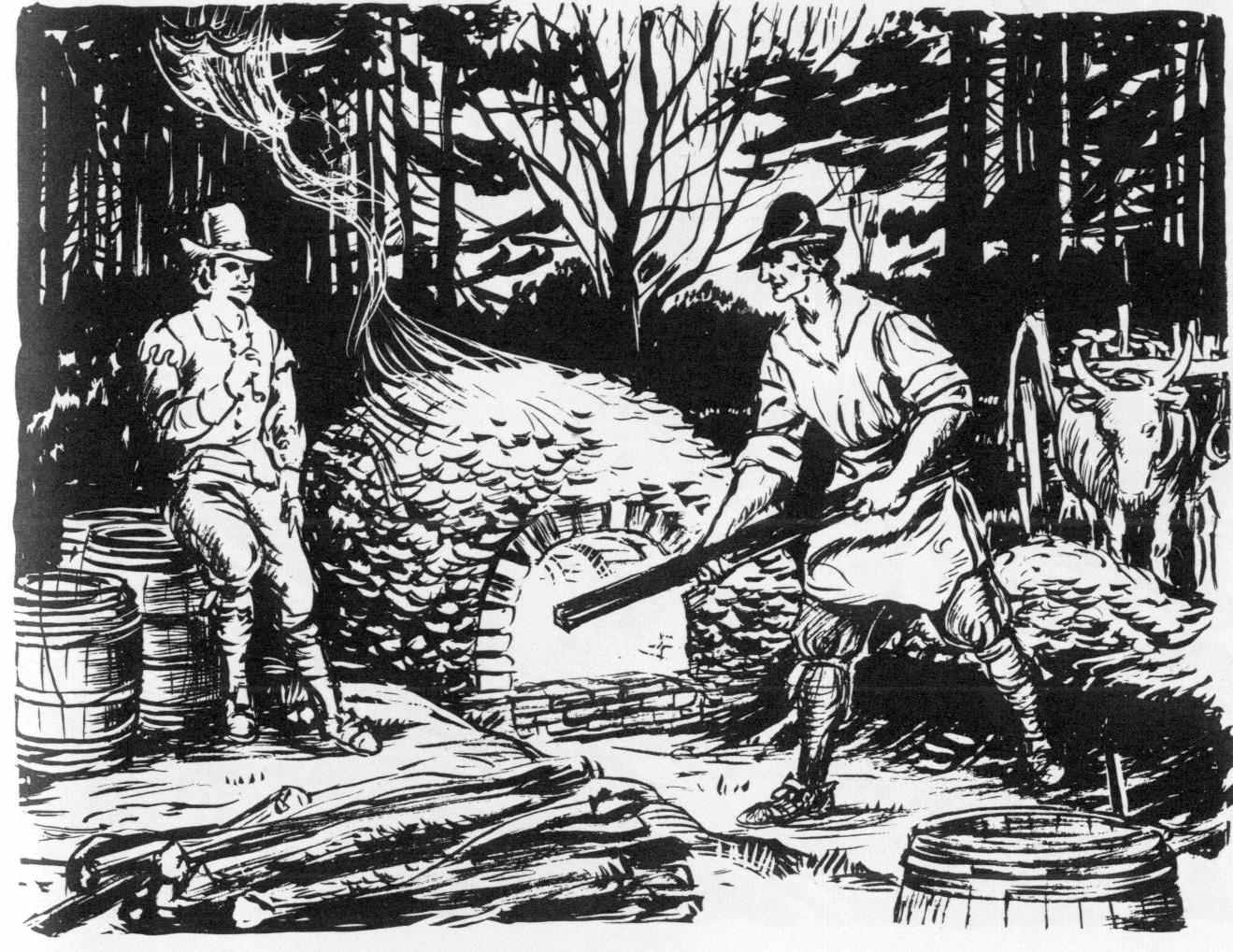 During the 17th century, active trade was carried on between the Virginia colony and the mother country. Local commodities of timber, wood products, soap ashes, iron ore, tobacco, pitch, tar, furs, minerals, salt, sassafras, and other New World raw materials were shipped to England. In exchange, English merchants sold to the colonists, tools, farm implements, seeds, stock and poultry, furniture and household accessories, clothing, weapons, hardware, kitchen utensils, pottery, metalware, glassware, and certain foods and drinks.