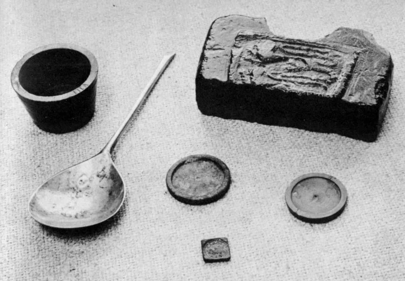 Types of spoons excavated include seal-heads, slipped ends, “puritans,” and trifids. The majority were made of either pewter or latten metal (a brasslike alloy), although 3 in the collection were made of silver. The earliest spoons found have rounded bowls and 6-sided stems (handles), whereas those made after 1650 usually have oval bowls and flat, 4-sided handles. One of the silver spoons, with rounded bowl and slipped end, bears the initials of its owner, WC/E,” on the slipped end of the handle. This spoon appears to have been made between 1600 and 1625, and is still in excellent condition.