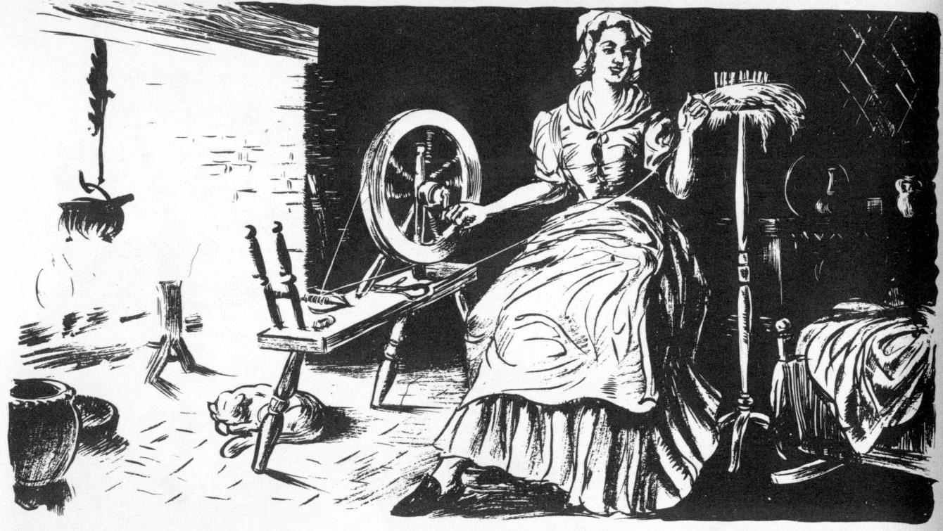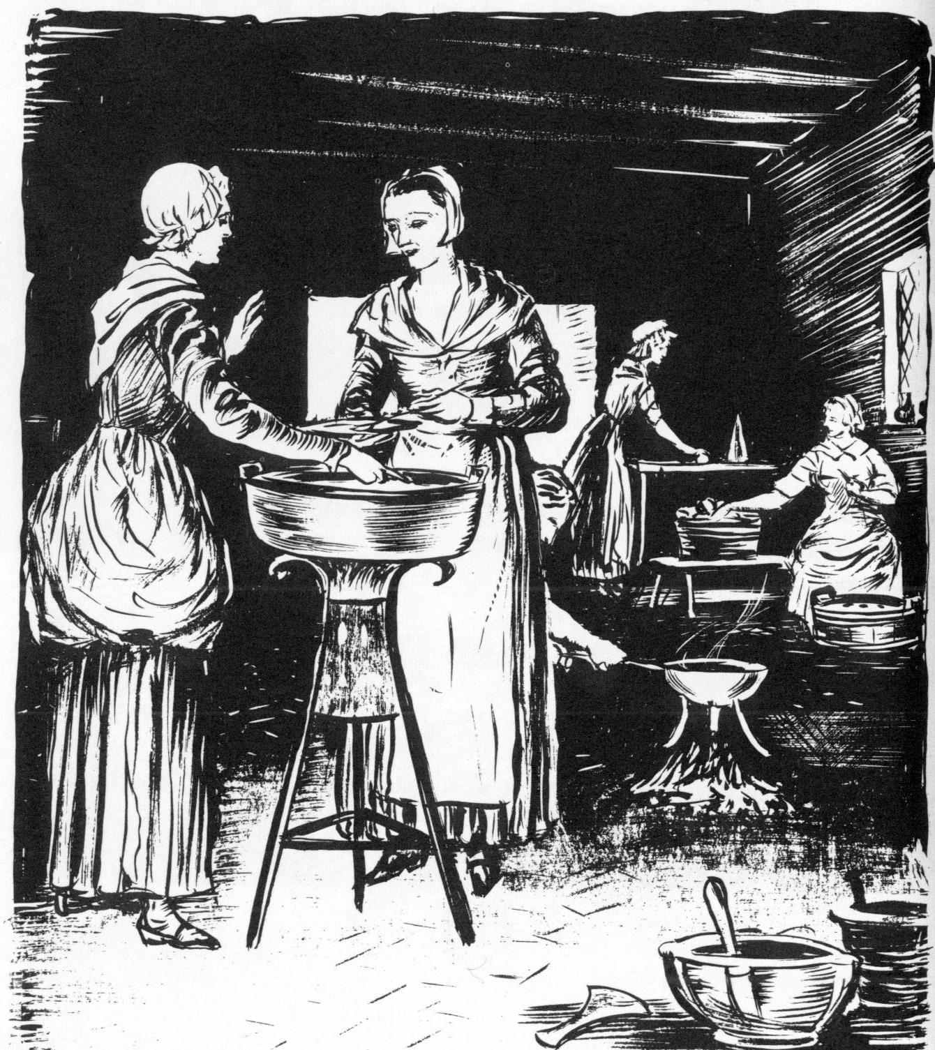 The women wore plain frocks and petticoats, although a few of the wealthy ladies owned silk, satin, and velvet dresses. Bodices, as a rule, were long pointed, and skirts were full and long.