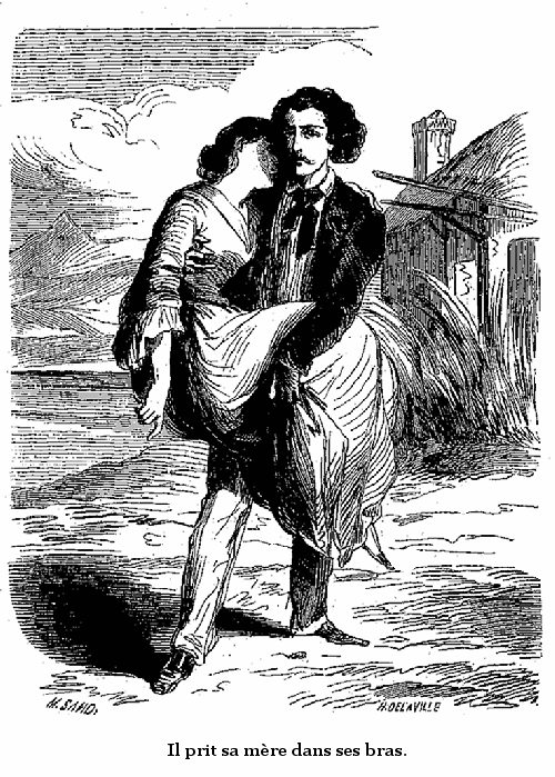 Ce dernier mot frappa au cœur de Célio. Il regarda le visage de sa mère, il vit qu'elle était morte en effet, quoiqu'elle eût encore l'œil ouvert et tranquille et la bouche souriante. Il tomba évanoui avec le cadavre sur le seuil du parc.