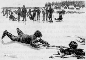 ”Pelasta Lunkentus! Pelasta Lunkentus!” huusi hän ensimmäiseksi, suu vielä täynnä vettä. Vesi valui hänen vaatteistansa ja saappaat äänsivät sipp, sipp, kuin hän jalkojansa liikutteli.