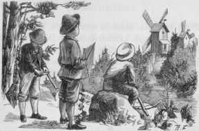 ”En minä ole mikään tyttö, minä olen mies”, kirkasi Valtteri, kepillänsä huitoen. Kuin ei tämä auttanut, keksi hän keinon; hän päästi hameen irti ja heitti sen putoamaan. Hame jäi riippumaan katajapensaasen, ja Valtteri meni menojaan varsin kummallisessa puvussa. Pojat nauroivat, närhi ja orava nauroivat puitten oksilla ja koko metsässä syntyi aika, ilo.