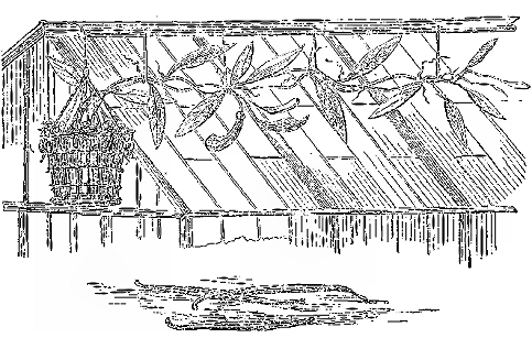 The flower buds are placed upon trays made of canvas stretched upon a frame rack, being not less than twelve feet long by four feet wide. When charged they are placed on shelves in the warm cupboards till dry.