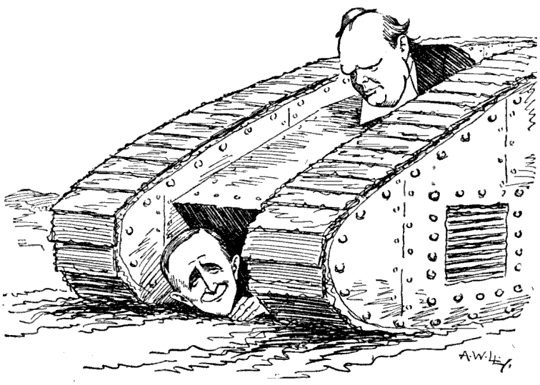 The latest type of Tank, Mr. Winston Churchill informed the House of Commons, weighs thirty tons and can pass over a brick without crushing it. It is said to be modelled on the Profiteering Act.