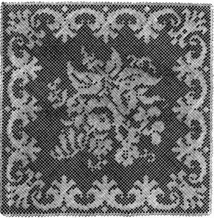 4th: Two on the loop, miss two, two on the loop, X miss two, two on the loop, one on every stitch, and two on the next loop (thirteen altogether), miss two, two on a loop, X repeat. The next diamond of holes must be so managed as to fall immediately between two of the first row. By repeating the first line, the place will be indicated. In all these stitches, it is assumed that squares are to be filled in. Where the shape varies from that, extra stitches must be added, at the beginning, or taken away, as the case may be, the worker referring to the engraving for the appearance intended to be produced.