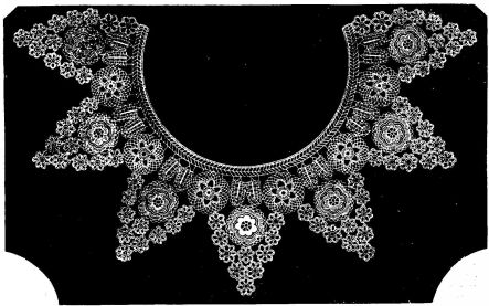 This is distinguished by close heavy work, and solid Spanish stitch edged with loops. The ground of the collar is guipured in the richest style, partly with plain Raleigh bars partly with those having semi-circular loops, dotted in the same manner. Sometimes two bars have a Mecklin wheel at the cross.
