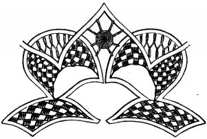 When spaces similar to those in the accompanying diagram are to be filled with Brussels lace, the best way is to work each side to the centre, and then run the needle up the middle, catching up alternately a stitch on each side. Sometimes the centre is not closed up at all.