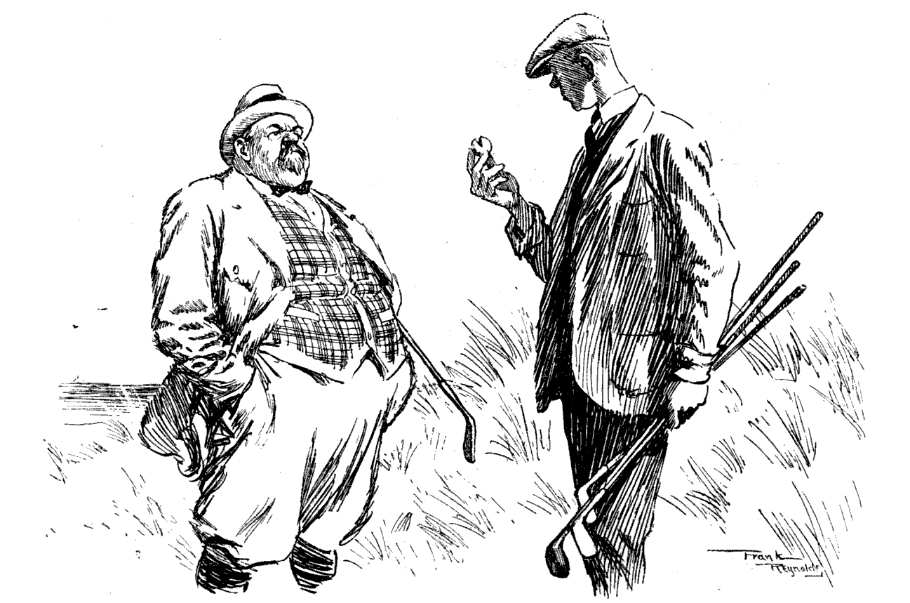 Professional (to self-made man having his first lesson). "You've hit this one hard enough, Sir, and no mistake. Why, I've never seen a ball gashed like that before."