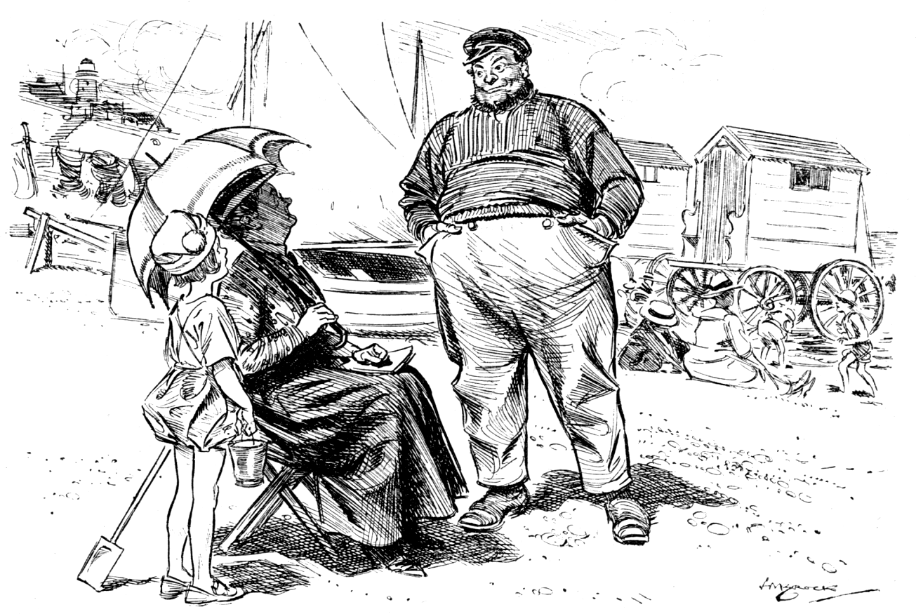 The removal of the hat was the last straw, for Edward's hair is provocatively red. My friend of the B.O.F. advanced towards him with the intention of exerting authority and restoring discipline. Edward turned at the sound of a stern voice. Possibly he might have put out his tongue—you never know with Edward. But, what was worse, far worse, he saw me. With a glad cry of "Daddy" he rushed to me and, regardless of the fact that his front was covered with green slime, the result of going ventre à pierre over the rocks, he flung his arms round my legs.