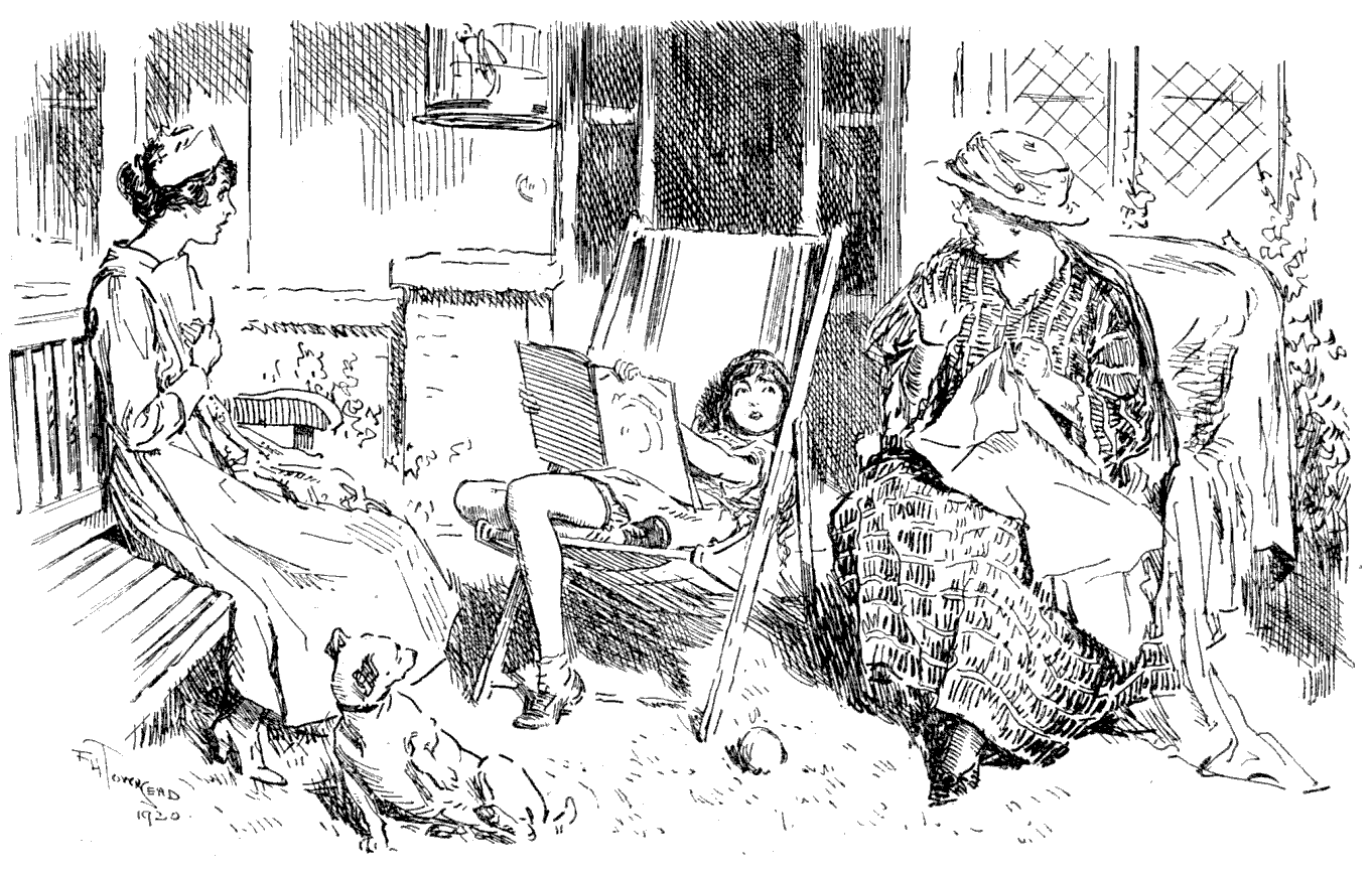 It was at this moment that Edward appeared. His route was the very centre of the lawn. He was wearing a battered Panama hat, a much-darned brownish jersey, and his nether man—or rather boy, for Edward's years are but four—was encased in paddling drawers made of the same material as a sponge-bag. Black sand-shoes completed his outfit, and a broken shrimping-net trailed behind him. At the moment when Edward first caught my horrified eye a particularly well-groomed young gentleman of about his own age caught Edward's eye in turn. Edward paused to survey this silken wonder with interest. Then, as if prompted thereto by the sight, he snatched off his hat and, casting it upon the ground, kicked it vigorously across the grass.