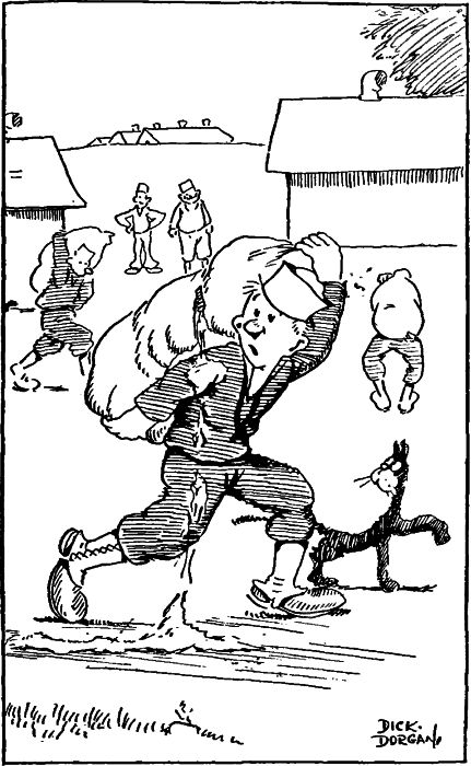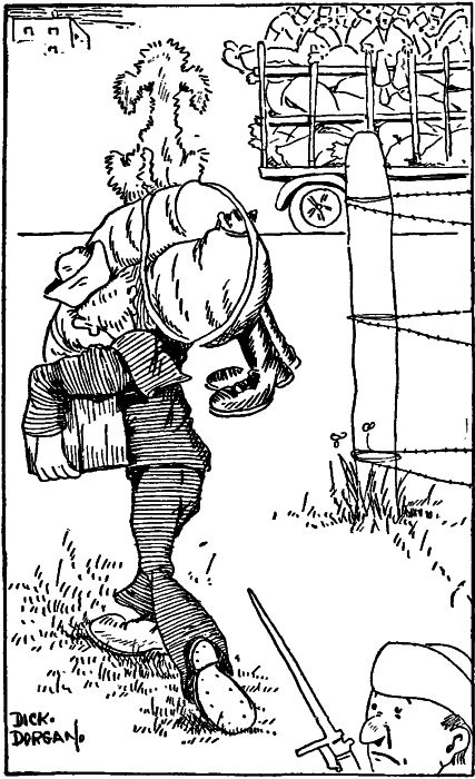 Aug. 17th. We were standing on a street corner of a neighboring town. The party consisted of Tim the barkeep, the "Spider," an individual who modestly acknowledged credit for having brought relief to several over-crowded safes in the good old civilian days; Tony, who delivered ice in my district also in those aforementioned days, and myself. These gentlemen for some time had been allowing me to exist in peace, and I had been showing my gratitude by buying them whatever little dainties they desired, but such a comfortable state of affairs could not long continue with that bunch. Suddenly, without any previous consultation, as if drawn together as it were by some fiendish undercurrent, they decided to make me unhappy—me, the only guy that spoke unbroken English in the crowd. This is the way they accomplished their low ends. When the next civilian came along they all of them shouted at me in tones that could be heard by all passers-by: