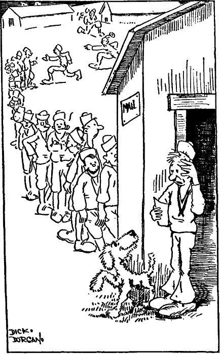 March 3d. Sunday—a day of rest, for which I gave, in the words of our indefatigable Chaplain, "three good, rollicking cheers." Some folks are coming up to see me this afternoon. I hear I must moo through the fence at them like a cow. (Later.) The folks have just left. Mother kept screaming through the wire about my underwear. She seemed to have it on her brain. There were several young girls standing right next to her. I really felt I was no longer a bachelor. Why do mothers lay such tremendous stress on underwear? They seem to believe that a son's sole duty to his parents consists in publicly announcing that he is clad in winter flannels.
