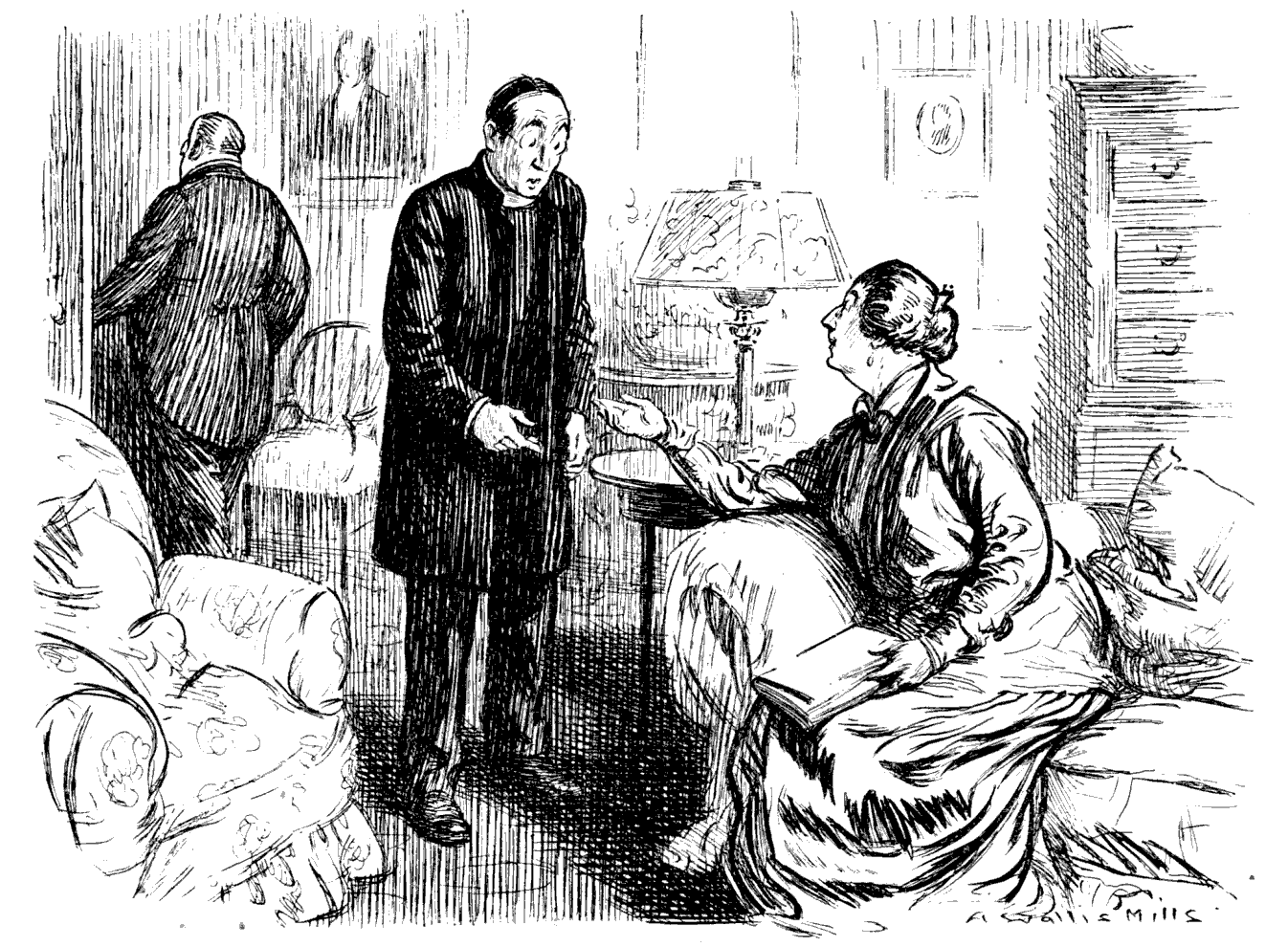 Lady of the Manor. "Howdy, Bo? Sit right down. I sure hope you're feeling full of pep! Excuse me, Vicar, but I'm practising a few phrases so that in case I meet any of this American invasion I can make them feel at home."