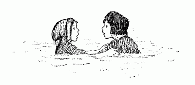 For some time she sat there hugging her knees and thinking long, long thoughts, and it was not until the sound of little waves lapping against the rocks roused her that she woke from her day dream and realized with terror that the tide had turned. The channels and lower levels of the bay were already brimming over, and the water was deep about the rocks on which she perched. At almost the same moment Dan had been surprised by a cold wave which washed over his bare feet, and, turning about, was dismayed to find a sheet of blue water covering the bay and to see Nancy standing on the topmost rock shouting "Dan! Dan!" [page 19] at the top of her lungs. For one astonished instant he looked at her, then, throwing down his shovel, he plunged unhesitatingly into the icy bath. And now Nancy, realizing that there was not a moment to lose if she hoped to reach the shore in safety, let herself slowly down off the rocks, leaving the basket behind her, and started toward her brother.