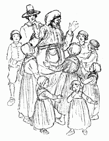 "We saw Captain Sanders in town," she said to the children. "He hath brought the Lucy Ann to port with a load of cod for [page 153] the market and with fish and game for Thanksgiving. I have his promise that he will dine with us if God wills. He hath not yet seen our new house. Alas! I shall have no tankard to set before him; yet, ungrateful that I am, we are still rich in blessings! 'T is well we have a day set aside to remind us of them."
