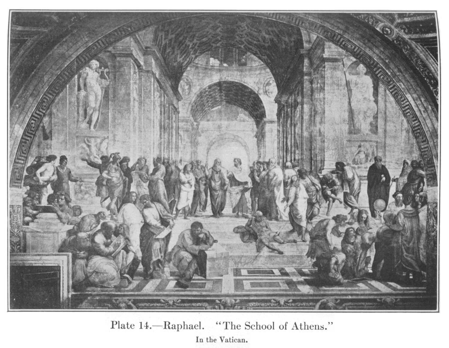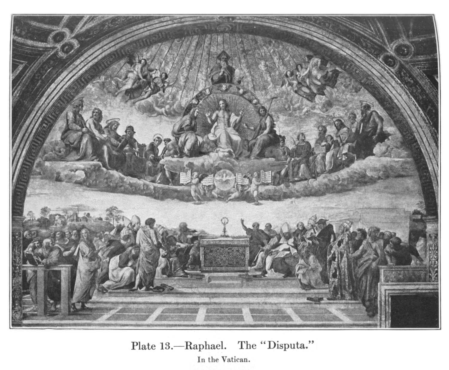 But it is the frescoes on the four walls of this room which are Raphael's greatest triumphs—the most perfect pieces of monumental decoration in the world. On the two longer walls, nearly unbroken lunettes of something over a semicircle, he painted the two great compositions of Theology and Philosophy known as the "Disputa" and the "School of Athens." The "Disputa" (Pl. 13), the earlier of the two, has the more connection with the art of the past. The use of gilded relief in the upper part recalls the methods of Pintoricchio, and the hint of the whole arrangement was doubtless taken from those semidomes which existed in many churches. But what an original idea it was to transform the flat wall of a room into the apse of a cathedral, and what a solemnity it imparts to the discussion that is going on! The upper part is formal in the extreme, as it need be for the treatment of such a theme, but even here there is variety as well as stateliness in the attitudes and the spacing. In the lower part the variety becomes almost infinite, yet there is never a jar—not a line or a fold of drapery that mars the supreme order of the whole. Besides the uncounted cherubs which float among the rays of glory or support the cloudy thrones of the saints and prophets, there are between seventy and eighty figures in the picture; yet the hosts of heaven and the church on earth seem gathered about the altar with its sacred wafer—the tiny circle which is the focus of the great composition and the inevitable goal of all regards, as it is the central mystery of Catholic dogma.