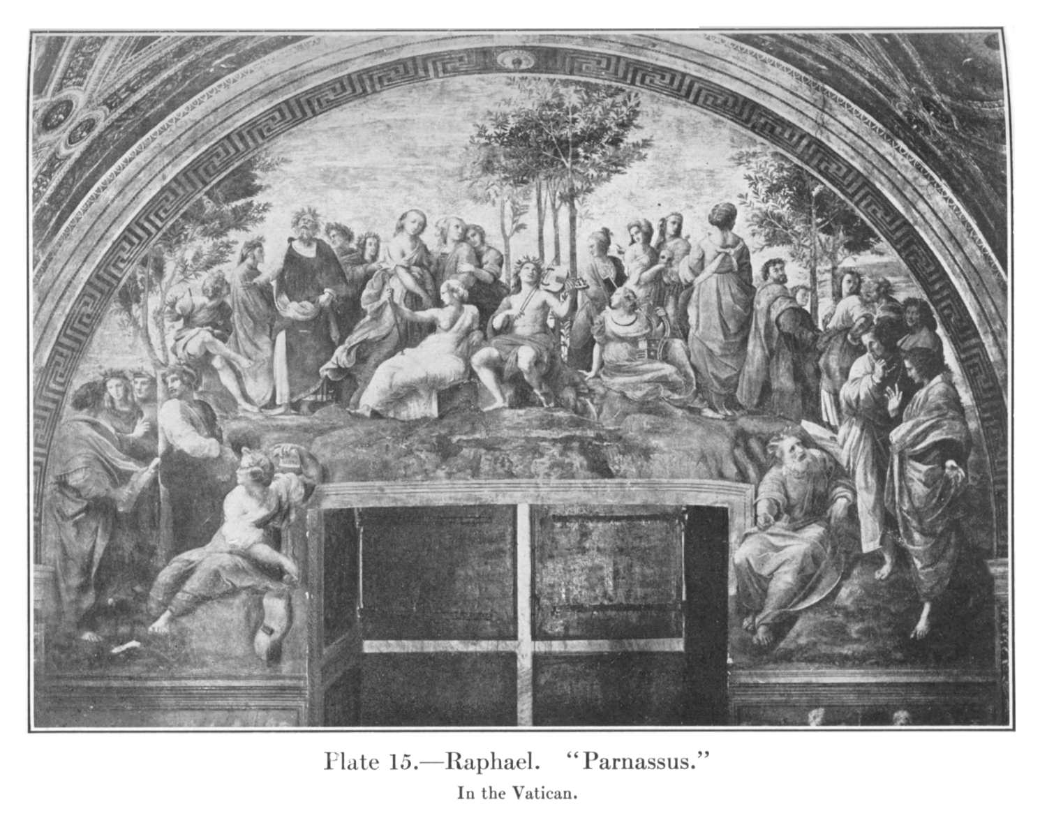 Each of these walls has a doorway at one end, and the way in which these openings are dissimulated and utilized is most ingenious, particularly in the "Disputa," where the bits of parapet which play an important part at either side of the composition, one pierced, the other solid, were suggested solely by the presence of this door. In the end walls the openings, large windows much higher than the doors, become of such importance that the whole nature of the problem is changed. It is the pierced lunette that is to be dealt with, and Raphael has dealt with it in two entirely different ways. One wall is symmetrical, the window in the middle, and on that wall he painted the "Parnassus" (Pl. 15), Apollo and the Muses in the centre with groups of poets a little lower on either side and other groups filling the spaces to right and left of the window head. At first sight the design seems less symmetrical and formal than the others, with a lyrical freedom befitting the subject, but in reality it is no less perfect in its ponderation. The group of trees above Apollo and the reclining figures either side of him accent the centrality of his position. From this point the line of heads rises in either direction to the figures of Homer and of the Muse whose back is turned to the spectator, and the perpendicularity of these two figures carries upward into the arch the vertical lines of the window. From this point the lateral masses of foliage take up the drooping curve and unite it to the arch, and this curve is strongly reinforced by the building up toward either side of the foreground groups and by the disposition of the arms of Sappho and of the poets immediately behind her, while, to disguise its formality, it is contradicted by the long line of Sappho's body, which echoes that of the bearded poet immediately to the right of the window and gives a sweep to the left to the whole lower part of the composition. It is the immediate and absolute solution of the problem, and so small a thing as the scarf of the back-turned Muse plays its necessary part in it, balancing, as it does, the arm of the Muse who stands highest on the left and establishing one of a number of subsidiary garlands that play through and bind together the wonderful design.