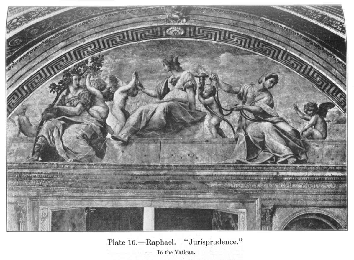 The window in the opposite wall is to one side of the middle, and here Raphael meets the new problem with a new solution. He places a separate picture in each of the unequal rectangles, carries a simulated cornice across at the level of the window head, and paints, in the segmental lunette thus left, the so-called "Jurisprudence" (Pl. 16), which seems to many decorators the most perfect piece of decorative design that even Raphael ever created—the most perfect piece of design, therefore, in the world. Its subtlety of spacing, its exquisiteness of line, its monumental simplicity, rippled through with a melody of falling curves from end to end, are beyond description—the reader must study them for himself in the illustration. One thing he might miss were not his attention called to it—the ingenious way in which the whole composition is adjusted to a diagonal axis that the asymmetry of the wall may be minimized. Draw an imaginary straight line from the boss in the soffit of the arch through the middle of the Janus-head of Prudence. It will accurately bisect the central group, composed of this figure and her two attendant genii, will pass through her elevated left knee, the centre of a system of curves, and the other end of it will strike the top of the post or mullion that divides the window opening into two parts.