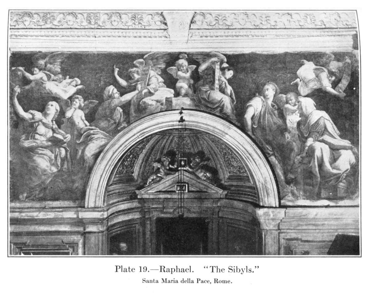 Yet even in what seems this decadence of his talent Raphael only needed a new problem to revive his admirable powers in their full splendor. In 1514 he painted the "Sibyls" (Pl. 19) of Santa Maria della Pace, in a frieze-shaped panel cut by a semicircular arch, and the new shape given him to fill inspired a composition as perfect in itself and as indisputably the only right one for the place as anything he ever did. Among his latest works were the pendentives of the Farnesina, with the story of Cupid and Psyche—works painted and even drawn by his pupils, coarse in types and heavy in color but altogether astonishing in freedom and variety of design. The earlier painters covered their vaulting with ornamental patterns in which spaces were reserved for independent pictures, like the rectangles of the Stanza della Segnatura. It was a bold innovation when Michelangelo discarded this system and placed in the pendentives of the Sistine his colossal figures of the Prophets and the Sibyls, each on its architectural throne. It was reserved for Raphael to take a step that no earlier painter could have dreamed of and to fill these triangular spaces with free groups relieved against a clear sky which is the continuous background of the whole series. One may easily think the earlier system more architecturally fitting, but the skill with which these groups are composed, their perfect naturalness, their exhaustless variety, the perfection with which they fill these awkward shapes, as it were inevitably and without effort, is nothing short of amazing. It is decoration of a festal and informal order—the decoration of a kind of summer house, fitted for pleasure, rather than of a stately chamber—but it is decoration the most consummate, the fitting last word of the greatest master of decorative design that the world has seen.