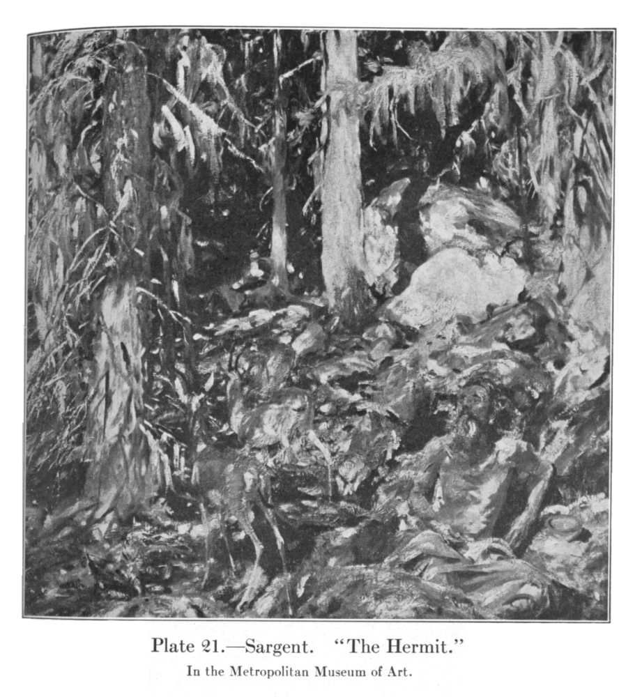 Among the modern paintings in the Metropolitan Museum is a brilliant and altogether remarkable little picture by John Sargent, entitled "The Hermit" (Pl. 21). Mr. Sargent is a portrait-painter by vocation, and the public knows him best as a penetrating and sometimes cruel reader of human character. He is a mural painter by avocation and capable, on occasion, of a monumental formality. In this picture, as in the wonderful collection of watercolors in the Brooklyn Institute of Arts and Sciences, one fancies one sees the essential John Sargent, working for himself alone without regard to external demands, and doing what he really cares most to do. In such work he is a modern of the moderns and, in the broadest sense of the word, a thorough Impressionist. Not that he shows himself a disciple of Monet or occupies himself with the broken touch or the division of tones—his method is as direct as that of Sorolla and his impressionism is of the same kind—a bending of all his energies to the vivid realization of the effect of the scene rendered as one might perceive it in the first flash of vision if one came upon it unexpectedly. This picture is better than Sorolla—it is better than almost any one. It is perhaps the most astonishing realization of the modern ideal, the most accomplished transcript of the actual appearance of nature, that has yet been produced. It is because of its great merit, because of its extraordinary success in what it attempts, that it leads one to the serious consideration of the nature of the attempt and of the gain and loss involved in the choice that modern art has made.