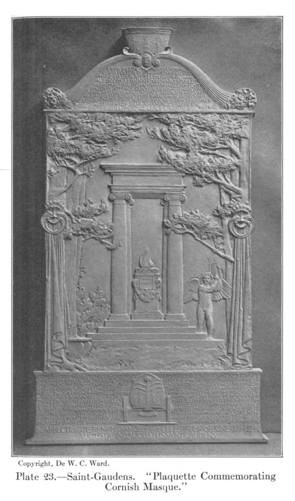 The merits of Saint-Gaudens's work were fully recognized in his lifetime. He was an officer of the Legion of Honor, a Corresponding Member of the Institute of France, a member of half a dozen academies, and the bearer of honorary degrees from the universities of Harvard, Yale, and Princeton. But of all the honors he received there were two, one of a public, the other of a private nature, which he himself valued most highly: the one as showing the estimation in which his art was held by his fellow artists, the other as an evidence of the personal affection felt for him by his friends. At the Pan-American Exposition in 1901, upon the unanimous recommendation of the Jury of Fine Arts, composed of painters, sculptors, and architects, he was awarded a special diploma and medal of honor, "apart from and above all other awards," an entirely exceptional honor, which marked him as the first of American artists, as previously received honors had marked him one of the greatest sculptors of his time. On June 23, 1905, the artistic and literary colony which had gradually grown up about his home in Cornish celebrated the twentieth anniversary of his coming there by a fête and open-air masque held in the groves of Aspet. The beauty of this spectacle has become almost legendary. The altar with its columned canopy, which served for a background to the play, still stands, or recently stood, though much dilapidated by weather, as it was immortalized by the sculptor himself in a commemorative plaquette (Pl. 23) which is among the most charming of his minor works. He planned if he had lived to perpetuate it in enduring marble, and this task has now been taken up by his wife, who means to dedicate the monument as a fitting memorial to a great artist and a noble man in the place he loved as his chosen home.