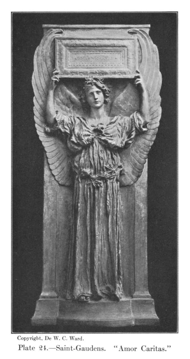 Of course, his style was not formed in a moment. His "Hiawatha" seems, to-day, much such a piece of neo-classicism as was being produced by other men in the Rome of that time, and the "Silence," though somewhat more modern in accent, is an academic work such as might have been expected from a docile pupil of his master. The relief of angels for the reredos of Saint Thomas's Church is the earliest important work which shows his personal manner. It was undertaken in collaboration with John La Farge, and perhaps the influence of La Farge, and of that eminently picturesque genius Stanford White, mingled with that of the younger French school in forming its decorative and almost pictorial character. It was a kind of improvisation, done at prodigious speed and without study from nature—a sketch rather than a completed work of art, but a sketch to be slowly developed into the reliefs of the Farragut pedestal, the angels of the Morgan tomb, the caryatids of the Vanderbilt mantelpiece, and, at length, into such a masterpiece as the "Amor-Caritas." In each of these developments the work becomes less picturesque and more formal, the taste is purified, the exuberance of decorative feeling is more restrained. The final term is reached in the caryatids for the Albright Gallery at Buffalo—works of his last days, when his hands were no longer able to shape the clay, yet essentially his though he never touched them; works of an almost austere nobility of style, the most grandly monumental figures he ever produced.