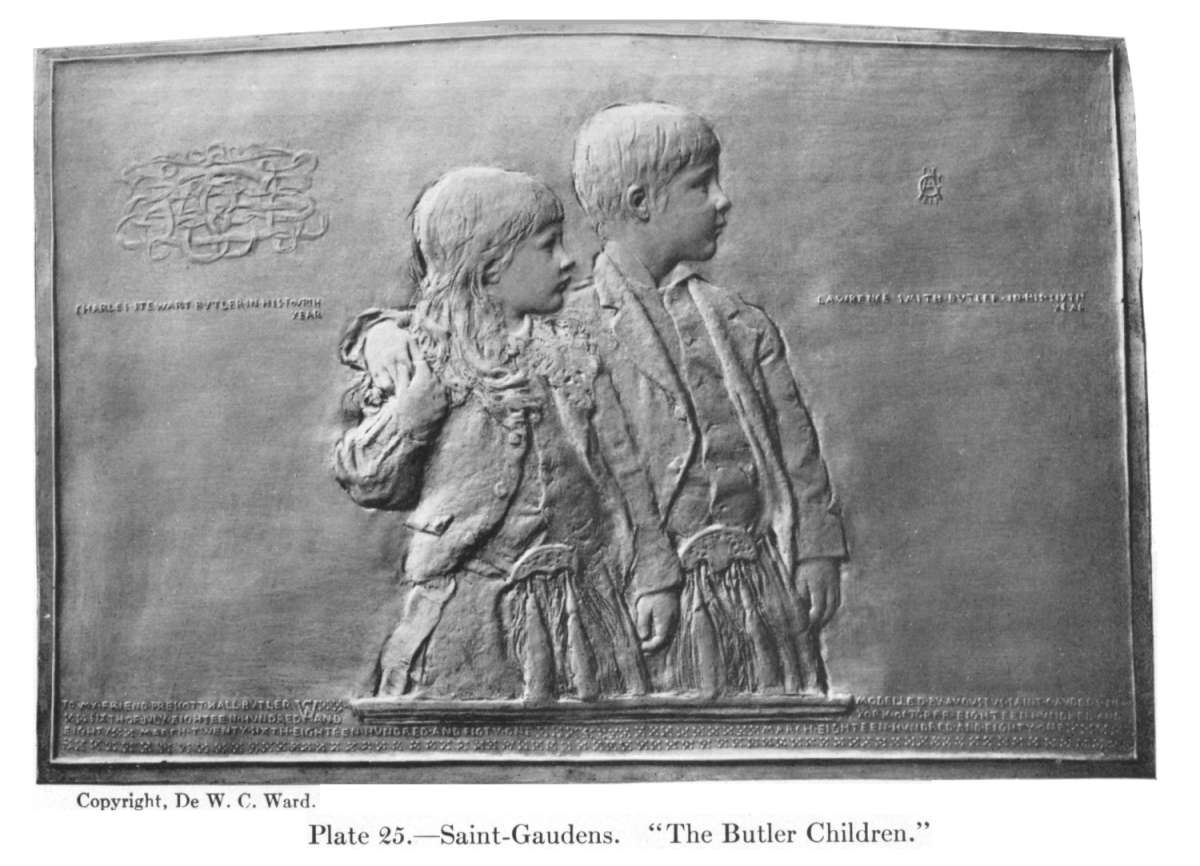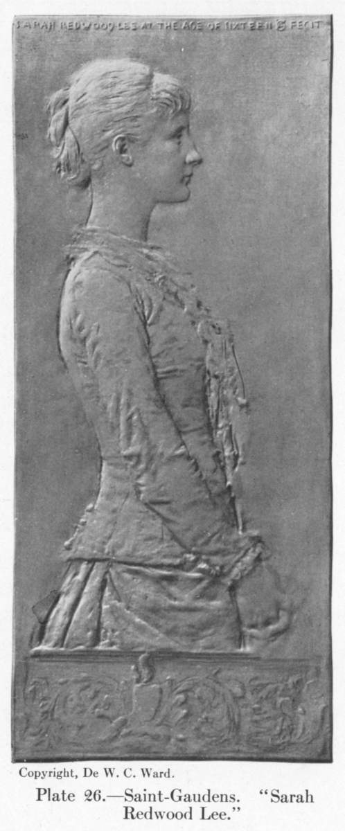 He has produced a series of works which run through the whole range of the art, from lowest relief to highest; from things of which the relief is so infinitesimal that they seem as if dreamed into existence rather than wrought in bronze or marble to things which are virtually engaged statues; from things which you fear a chance touch might brush away, like a pastel of Whistler's, to things as solid and enduring in appearance as in actual material. And in all these things there is the same inevitable mastery of design and of drawing, the same infinite resource and the same technical perfection. The "Butler Children" (Pl. 25), the "Schiff Children," the "Sarah Redwood Lee" (Pl. 26), to name but a few of his masterpieces of this kind, are in their perfection of spacing, their grace of line, their exquisite and ethereal illusiveness of surface, comparable only to the loveliest works of the Florentine Renaissance; while the assured mastery of the most complicated problems of relief evinced in the "Shaw Memorial"—a mastery which shows, in the result, no trace of the strenuous and long-continued effort that it cost—is unsurpassed—I had almost said unequalled—in any work of any epoch.