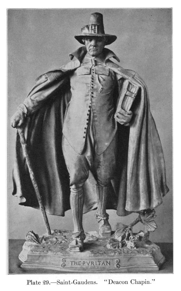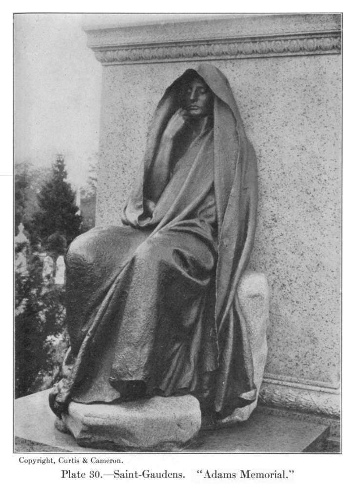 But if Saint-Gaudens's imagination was thus capable of raising the portrait to the dignity of the type, it was no less capable of endowing the imagined type with all the individuality of the portrait. In the "Deacon Chapin" (Pl. 29), of Springfield, we have a purely ideal production, the finest embodiment of New England Puritanism in our art, for no portrait of the real Chapin existed. This swift-striding, stern-looking old man, who clasps his Bible as Moses clasped the tables of the law and grips his peaceful walking-stick as though it were a sword, is a Puritan of the Puritans; but he is an individual also—a rough-hewn piece of humanity with plenty of the old Adam about him—an individual so clearly seen and so vigorously characterized that one can hardly believe the statue an invention or realize that no such old Puritan deacon ever existed in the flesh. Something of this imaginative quality there is in almost everything Saint-Gaudens touched, even in his purely decorative figures. His angels and caryatides are not classical goddesses but modern women, lovely, but with a personal and particular loveliness, not insisted upon but delicately suggested. And it is not the personality of the model who chanced to pose for them but an invented personality, the expression of the nobility, the sweetness, and the pure-mindedness of their creator. And in such a figure as that of the "Adams Memorial" (Pl. 30), in Rock Creek Cemetery in Washington, his imaginative power reaches to a degree of impressiveness almost unequalled in modern art. One knows of nothing since the tombs of the Medici that fills one with the same hushed awe as this shrouded, hooded, deeply brooding figure, rigid with contemplation, still with an eternal stillness, her soul rapt from her body on some distant quest. Is she Nirvana? Is she The Peace of God? She has been given many names—her maker would give her none. Her meaning is mystery; she is the everlasting enigma.
