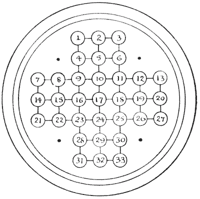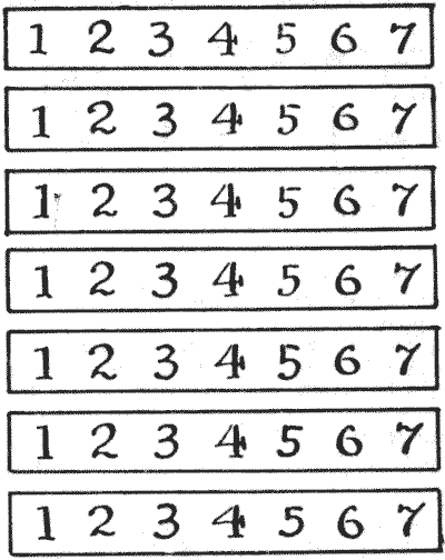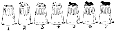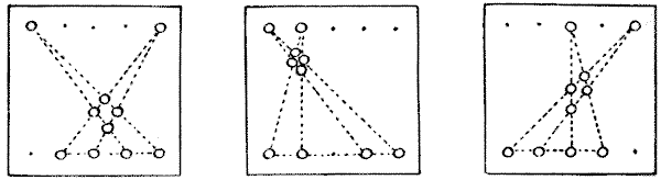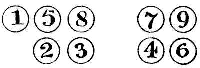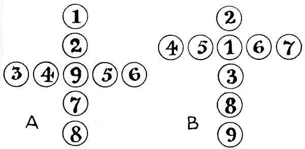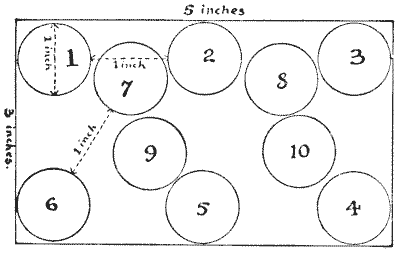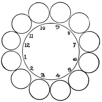 Our observation of little things is frequently defective, and our memories very liable to lapse. A certain judge recently remarked in a case that he had no recollection whatever of putting the wedding-ring on his wife's finger. Can you correctly answer these questions without having the coins in sight? On which side of a penny is the date given? Some people are so unobservant that, although they are handling the coin nearly every day of their lives, they are at a loss to answer this simple question. If I lay a penny flat on the table, how many other pennies can I place around it, every one also lying flat on the table, so that they all touch the first one? The geometrician will, of course, give the answer at once, and not need to make any experiment. Pg 5He will also know that, since all circles are similar, the same answer will necessarily apply to any coin. The next question is a most interesting one to ask a company, each person writing down his answer on a slip of paper, so that no one shall be helped by the answers of others. What is the greatest number of three-penny-pieces that may be laid flat on the surface of a half-crown, so that no piece lies on another or overlaps the surface of the half-crown? It is amazing what a variety of different answers one gets to this question. Very few people will be found to give the correct number. Of course the answer must be given without looking at the coins.