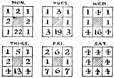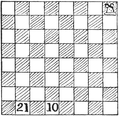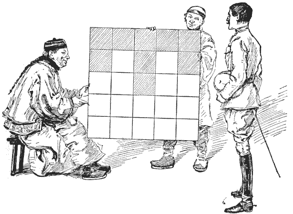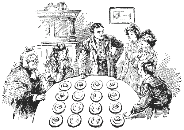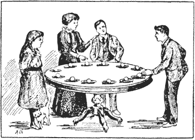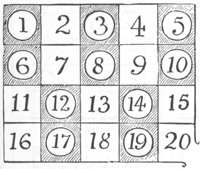 Every one is familiar with the difficulties that frequently arise over the giving of change, and how the assistance of a third person with a few coins in his pocket will sometimes help us to set the matter right. Here is an example. An Englishman went into a shop in New York and bought goods at a cost of thirty-four cents. The only money he had was a dollar, a three-cent piece, and a two-cent piece. The tradesman had only a half-dollar and a quarter-dollar. But another customer happened to be present, and when asked to help produced two dimes, a five-cent piece, a two-cent piece, and a one-cent piece. How did the tradesman manage to give change? For the benefit of those readers who are not familiar with the American coinage, it is only necessary to say that a dollar is a hundred cents and a dime ten cents. A puzzle of this kind should rarely cause any difficulty if attacked in a proper manner.