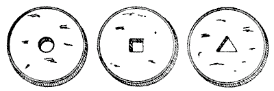 The Chinese are a curious people, and have strange inverted ways of doing things. It is said that they use a saw with an upward pressure instead of a downward one, that they plane a deal board by pulling the tool toward them instead of pushing it, and that in building a house they first construct the roof and, having raised that into position, proceed to work downwards. In money the currency of the country consists of taels of fluctuating value. The tael became thinner and thinner until 2,000 of them piled together made less than three inches in height. The common cash consists of brass coins of varying thicknesses, with a round, square, or triangular hole in the centre, as in our illustration.