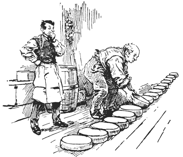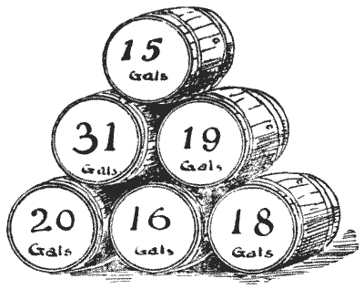 A country "grocer and draper" had two rival assistants, who prided themselves on their rapidity in serving customers. The young man on the grocery side could weigh up two one-pound parcels of sugar per minute, while the drapery assistant could cut three one-yard lengths of cloth in the same time. Their employer, one slack day, set them a race, giving Pg 6the grocer a barrel of sugar and telling him to weigh up forty-eight one-pound parcels of sugar While the draper divided a roll of forty-eight yards of cloth into yard pieces. The two men were interrupted together by customers for nine minutes, but the draper was disturbed seventeen times as long as the grocer. What was the result of the race?