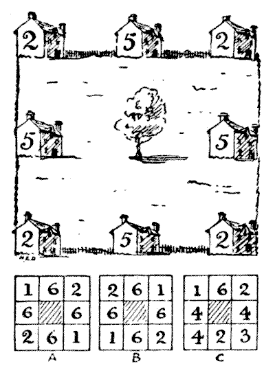There is perhaps no class of puzzle over which people so frequently blunder as that which involves what is called the theory of probabilities. I will give two simple examples of the sort of puzzle I mean. They are really quite easy, and yet many persons are tripped up by them. A friend recently produced five pennies and said to me: "In throwing these five pennies at the same time, what are the chances that at least four of the coins will turn up either all heads or all tails?" His own solution was quite wrong, but the correct answer ought not to be hard to discover. Another person got a wrong answer to the following little puzzle which I heard him propound: "A man placed three sovereigns and one shilling in a bag. How much should be paid for permission to draw one coin from it?" It is, of course, understood that you are as likely to draw any one of the four coins as another.