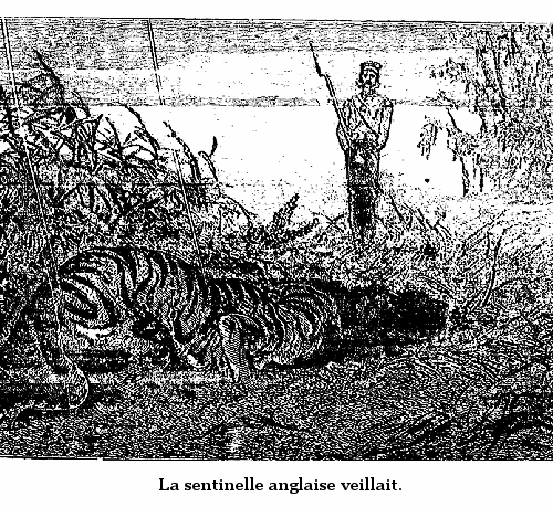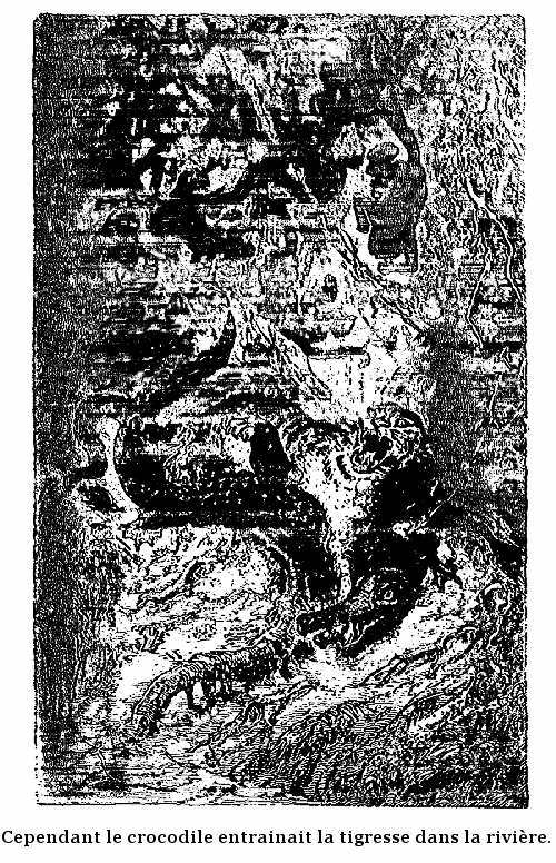 Lakmana, toujours suivi de son inséparable Louison, ouvrit la porte de cette chambre. La tigresse, curieuse comme toutes les femmes et la plupart des chattes, ennuyée d'ailleurs de l'obscurité profonde de l'escalier qu'elle venait de grimper à la suite du brahmine, n'eut pas plutôt aperçu la fenêtre ouverte d'où l'on apercevait ce paysage délicieux, sans égal dans l'univers, qu'elle oublia sa prudence ordinaire et se précipita dans la chambre. Mais, hélas! c'est là que l'attendait le traître Lakmana.
