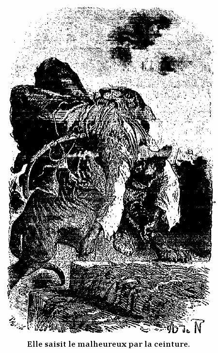 La trappe dont il venait de pousser le ressort, céda tout à coup sous le poids de notre pauvre amie qui tomba, sans pouvoir s'accrocher à rien, dans un précipice effroyable. A peine eut-elle le temps de pousser un cri et un rugissement et d'invoquer la justice divine contre le perfide brahmine. Sa chute produisit un bruit mat, pareil à celui d'une grappe de raisin qu'on écraserait contre un mur. Il se pencha sur l'ouverture, écouta un instant, n'entendit plus rien et poussa, quoique seul, un bruyant éclat de rire, qui dut faire frissonner au fond des enfers Lucifer lui-même, son cousin-germain.