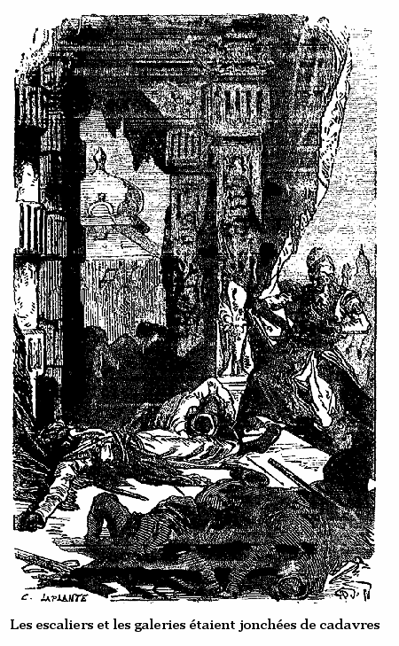 Cependant le bruit des applaudissements s'était apaisé, et Corcoran allait continuer son discours, lorsqu'un grand tumulte se fit entendre à la grande porte d'entrée: on vit tout le monde s'écarter et donner des marques d'une frayeur épouvantable. Déjà Sougriva s'avançait pour connaître la cause de ce désordre, lorsqu'au milieu du passage laissé vide, Louison s'avança lentement, couverte de sang et portant dans sa gueule le corps inanimé de Lakmana.
