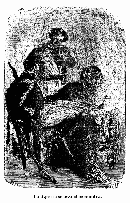 La tigresse s'approcha d'un air caressant et vint frotter doucement sa belle tête sur les genoux de Corcoran. Ses yeux épiaient avec attention les yeux de son ami et cherchaient à deviner sa pensée.