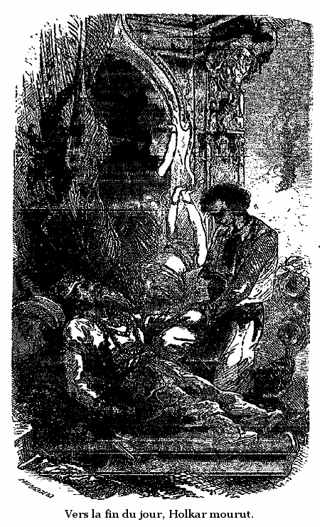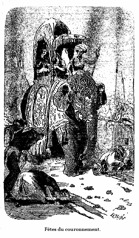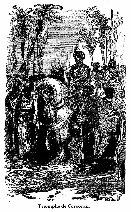 Tous deux, montés sur l'éléphant Scindiah, vêtus d'habits d'or et d'argent, ornés de diamants et de pierreries d'une valeur inestimable, s'avançaient majestueusement dans la foule prosternée qui admirait la jeunesse, la force et le génie de Corcoran et l'incomparable et douce beauté de Sita, quand ils eurent, suivis de tous les députés du peuple, rendu hommage dans la grande pagode de Bhagavapour au resplendissant Indra, l'Être des êtres, père des dieux et des hommes, ils revinrent en grande pompe vers le palais où Corcoran s'assit sur son trône, ayant à ses côtés la fille d'Holkar et en face de lui l'assemblée.