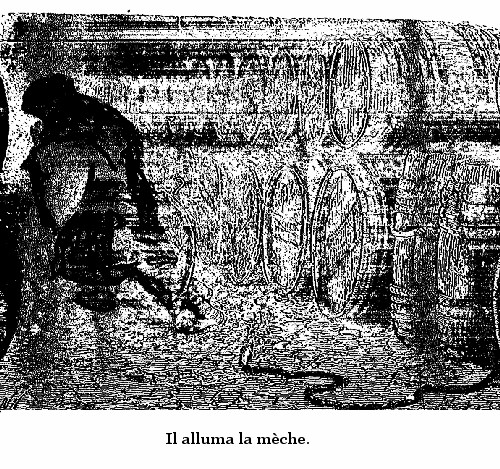 Pendant qu'il feignait de rire et de ne songer qu'aux festins, il préparait secrètement une terrible catastrophe. Il avait fait déblayer un vieux souterrain de cent pas de long qui, de sa maison, communiquait par des détours connus de lui seul avec une cave abandonnée du palais d'Holkar. C'est dans cette cave, placée au-dessous de la grande salle où devait se tenir la première réunion du parlement mahratte, que Lakmana avait fait placer par deux serviteurs fidèles ses six tonneaux de poudre. Lui-même, pendant une absence momentanée de Louison, qui allait souvent voir Corcoran au palais, disposa la mèche fatale destinée à mettre le feu aux poudres et à faire sauter avec Corcoran et Sita les plus puissants seigneurs du pays mahratte et tous ceux qui pouvaient lui disputer le trône.