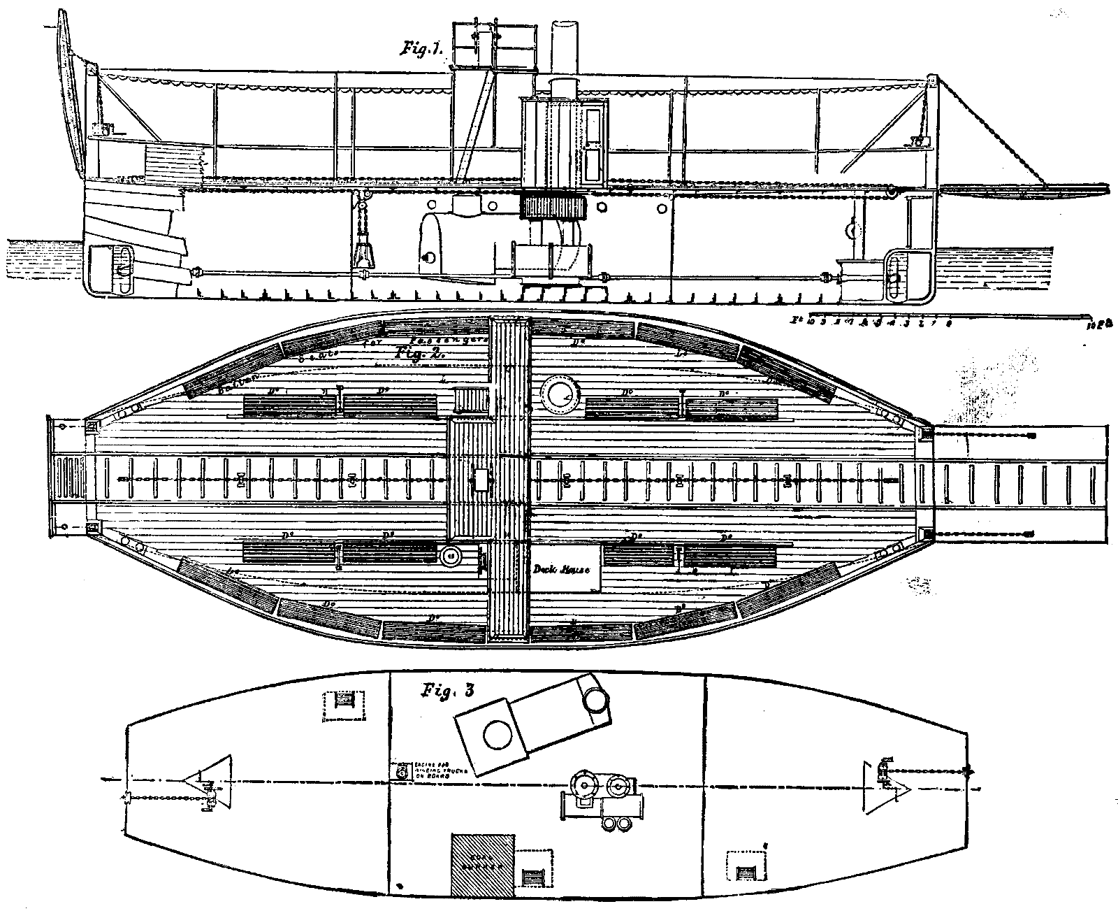 The seats shown on the deck are for the convenience of foot passengers, and the whole of the deck is protected from the sun of that tropical climate by a canvas awning. The steering of the vessel is effected from the bridge at the center, which extends from side to side of the vessel, and there are two steering wheels with independent steering gear for each end, with locking gear for the forward rudder when in motion. The man at the wheel communicates with the engineer by means of a speaking tube at the wheel. There is a small deck house for the use of deck stores, on one side of which is the entrance to the engine room. The cross battens, shown between the rails, are for the purpose of horse traffic, when horses are used for hauling the trucks, or for ordinary carts or wagons. The plan below deck shows the arrangement of the bulkheads, with a small windlass at each end for lifting the anchors, and a small hatch at each side for entrance to these compartments. The central compartment contains the machinery, which consists of a pair of compound surface condensing engines, with cylinders 11 in. and 20 in. in diameter; the shafting running the whole length of the vessel, with a propeller at each end. Steam is generated in a steel boiler of locomotive form, so arranged that the funnel passes through the deck at the side of the vessel; and it is designed for a working pressure of 100 lb. per square inch. This boiler also supplies steam for the small hauling engine fixed on the bulkhead. Light to this compartment is obtained by means of large side scuttles along each side of the boat and glass deck lights, and the iron grating at the entrance near the deck house. This boat was constructed in six pieces for shipment, and the whole put together in the builders' yard. The machinery was fixed, and the engine driven by steam from its own boiler, then the whole was marked and taken asunder, and shipped to the West Indies, where it was put together and found to answer the purpose intended.—Engineering.