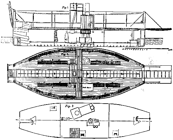 The illustrations above represent a double screw steam ferry boat for transporting railway carriages, vehicles, and passengers, etc., designed and constructed by Messrs. Edwards and Symes, of Cubitt Town, London. The hull is constructed of iron, and is of the following dimensions: Length 60 ft.; beam 16 ft.; over sponsons 25 ft. The vessel was fitted with a propeller, rudder, and steering gear at each end, to enable it to run in either direction without having to turn around. The boat was designed for the purpose of working the train service across the bay of San Juan, in the island of Puerto Rico, and for this purpose a single line of steel rails, of meter gauge, is laid along the center of the deck, and also along the hinged platforms at each end. In the engraving these platforms are shown, one hoisted up, and the other lowered to the level of the deck. When the boat is at one of the landing stages, the platform is lowered to the level of the rails on the pier, and the carriages and trucks are run on to the deck by means of the small hauling engine, which works an endless chain running the whole length of the deck. The trucks, etc., being on board, the platform is raised by means of two compact hand winches worked by worm and worm-wheels in the positions shown; thus these two platforms form the end bulwarks to the boat when crossing the bay. On arriving at the opposite shore the operation is repeated, the other platform is lowered, and the hauling engine runs the trucks, etc., on to the shore. With a load of 25 tons the draught is 4 ft.