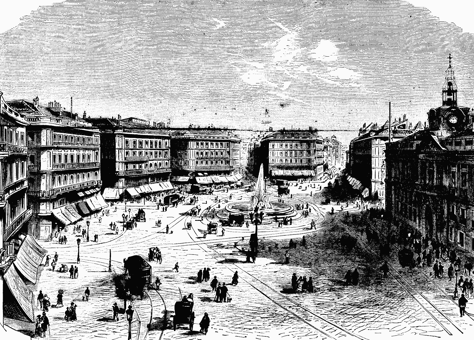 Puerta del Sol, or Gate of the Sun, Madrid, is the most famous and favorite public square in the Spanish city of Madrid. It was the eastern portal of the old city. From this square radiate several of the finest streets, such as Alcala, one of the handsomest thoroughfares in the world, Mayor, Martera, Carretas, Geronimo. In our engraving the post office is seen on the right. Large and splendid buildings adorn the other sides, which embrace hotels, cafes, reading rooms, elegant stores, etc. From this square the street railway lines traverse the city in all directions. The population of the city is about 400,000. It contains many magnificent buildings. Our engraving is from Illustrirte Zeitung.