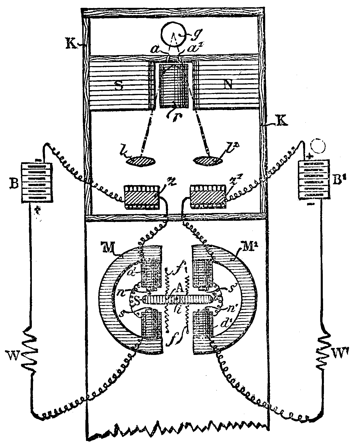 The bobbins of the magnet, M, are mounted in series with the selenium plates, z, the local battery, B, and a resistance box, W. Those of the magnet, M', are in series with z', B', and W'. The local batteries, B and B', are composed of quite a large number of elements. The current from the battery, B, traverses the selenium plates and the bobbins of the magnet, M, and returns to B through the rheostat, W; and the same occurs with the current from B'. The two currents, then, are absolutely independent of one another.