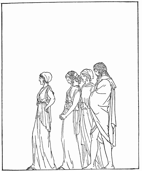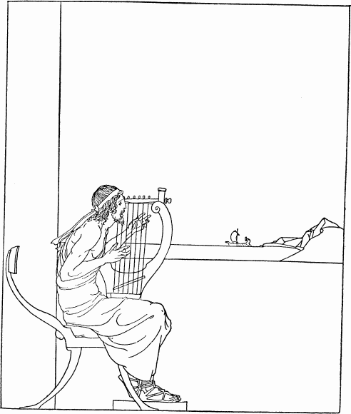 Phemius came and the wooers called upon him to sing them a tale. And the minstrel, in flowing verse, began the tale of the return of the Kings and Princes from Troy, and of how some god or goddess put a trouble upon them as they left the City they had taken. And as the minstrel began the tale, Penelope, Telemachus' lady-mother, was coming down the stairs with two hand-maids beside her. She heard the words he sang, and she stood still in her grief and drew her veil across her face. 'O Phemius,' she cried, 'cease from that story that ever wastes my heart—the story that has brought me sorrow and that leaves me comfortless all my days! O Phemius, do you not know other tales of men and gods that you might sing in this hall for the delight of my noble wooers?'
