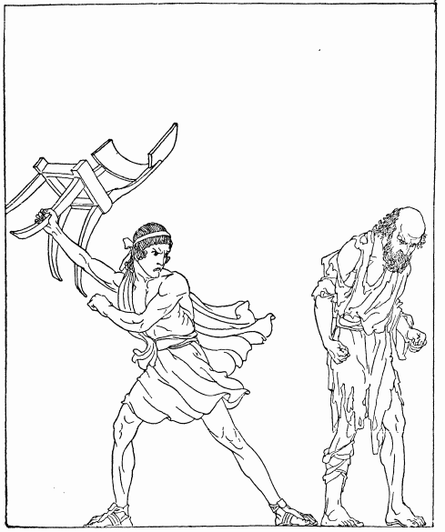 When the cattle-herd, Philœtius, saw a stranger in the guise of a beggar, he called out as he tethered the calf in the yard, 'Hail, stranger friend! My eyes fill with tears as I look on thee. For even now, clad as thou art in rags, thou dost make me think of my master Odysseus, who may be a wanderer such as thou in friendless lands. Ah, that he might return and make a scattering of the wooers in his hall.' Eumæus the swineherd came up to Philœtius and made the same prayer. These two, and the ancient woman at the quern, were the only ones of his servants whom he heard pray for his return.