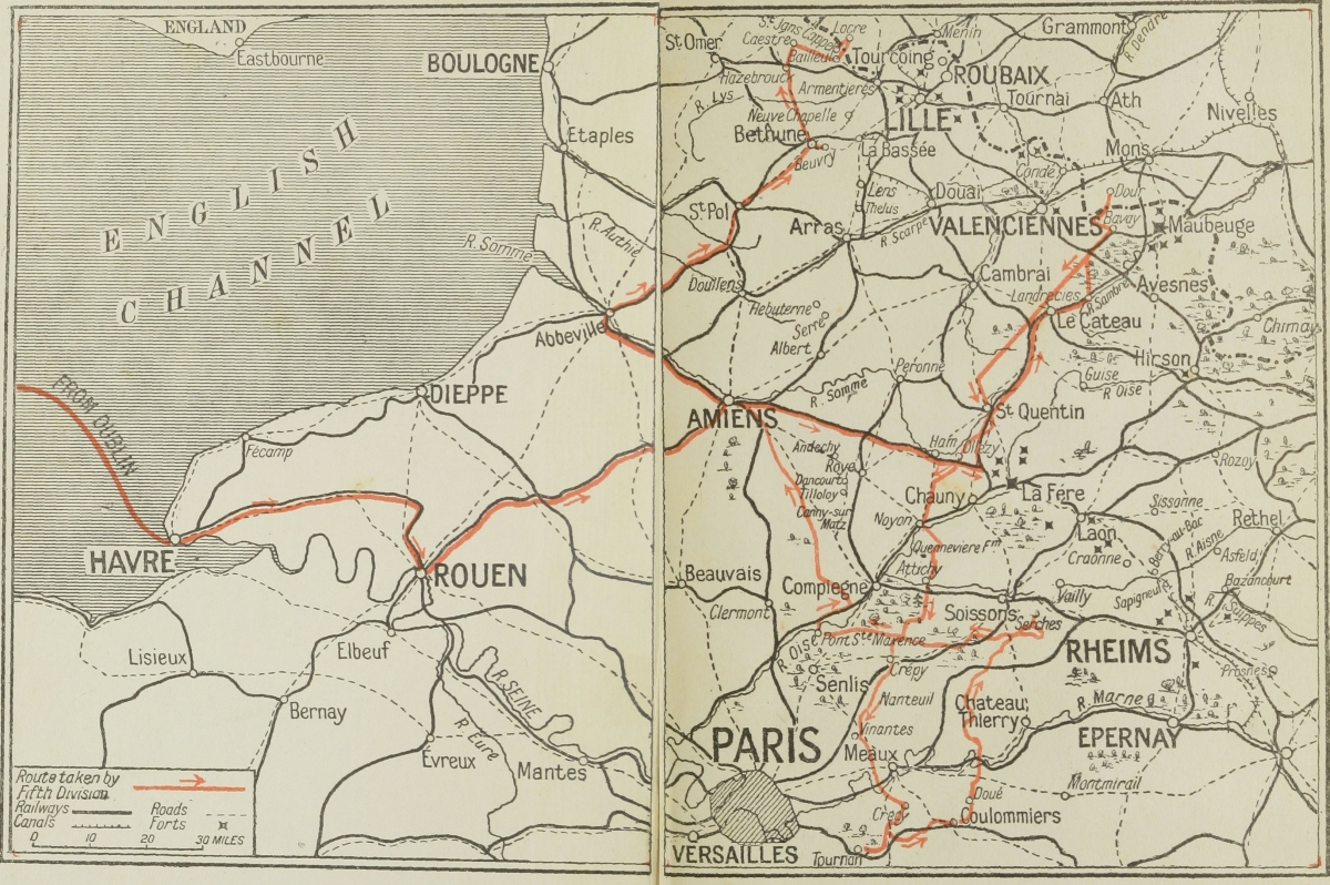 At Rouen we drew up at a siding, and sent porters scurrying for bread and butter and beer, while we loaded up from women who came down to the train with all sorts of delicious little cakes and sweets. We stopped, and then rumbled slowly towards Amiens. At St Roche we first saw wounded, and heard, I do not know with what truth, that four aviators had been killed, and that our General, Grierson, had died of heart failure. At Ham they measured me against a lamp-post, and ceremoniously marked the place. The next time I passed through Ham I had no time to look for the mark! It began to [Pg 19]grow dark, and the trees standing out against the sunset reminded me of our two lines of trees at home. We went slowly over bridges, and looked fearfully from our windows for bursting shells. Soon we fell asleep, and were wakened about midnight by shouted orders. We had arrived at Landrecies, near enough the Frontier to excite us.