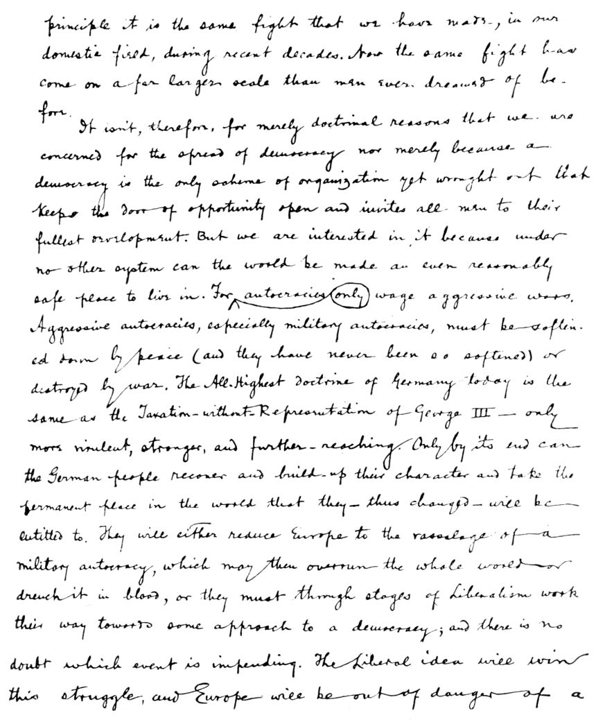 There could be no better measure of the immeasurable moral advance that the United States has made over Europe than the incredulity of our people. They simply can't comprehend what the Napoleonic legend can do, nor the low political morality of the Continent—of Berlin in particular. Hence they don't believe it. We have gone on for 100 years working might and main to better our condition and the condition of people about us—the greatest effort made by the largest number of people since [pg II-17] the world began to further the mood and the arts of peace. There is no other such chapter in human history as our work for a hundred years. Yet just a hundred years ago the Capitol at Washington was burned by—a political oligarchy in the freest country of Europe—as damnable an atrocity as you will find in history. The Germans are a hundred years behind the English in political development and political morality.