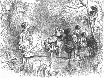 And at the quarters, where the happy slave-voices used to sing "Monkey Motions," and the merry feet used to dance to "Cotton-eyed Joe," weeds and thick underbrush have all grown up, and partridges build their nests there; and sometimes, at dusk, a wild-cat or a fox may be seen stealing across the old play-ground.