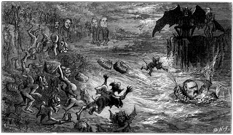 “It shel be done,” sed His Majesty, and forthwith Baron von Steedman, who hed command uv the King’s Household Body Guard, wuz sent for them. In a moment they wuz brot in. They wuz a mizable lookin set. Forney and Wendell Phillips wuz chained together, Fred Douglass and Anna Dickinson, Dick Yates and Gov. Morton, Ben Butler and Carl Shurz, Kelly and Covode, while Chase wuz tied to Horis Greely, onto whose back wuz a placard, inscribed, “The last uv the Tribunes;” at wich Raymond, who left the Radikels and declared for the empire at precisely the rite time, and wuz now editor of the Court Journal, laffed immodritly. Some one exclaimed, “Bring in Thad Stevens!” at wich His Majesty turned pale, and his knees smote together. “Don’t, don’t!” sez he; “he’s strength enuff left to wag his tongue. Keep him away! keep him away!” and he showed ez much fear ez men do in delirum tremens when they see snakes.