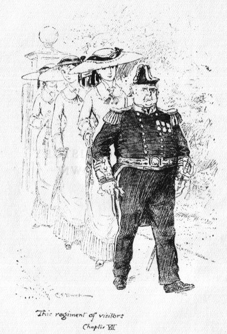 The Admiral, who happened by the merest chance to be sauntering along the Station Road this morning, in his best blue frock-coat with a flower in the buttonhole, corrected some of the rumours, but without much success. Finding the throng so thick, he held a long debate between curiosity and dignity. The latter won, and he returned to No. 2, Alma Villas, in a flutter, some ten minutes before the train was due.